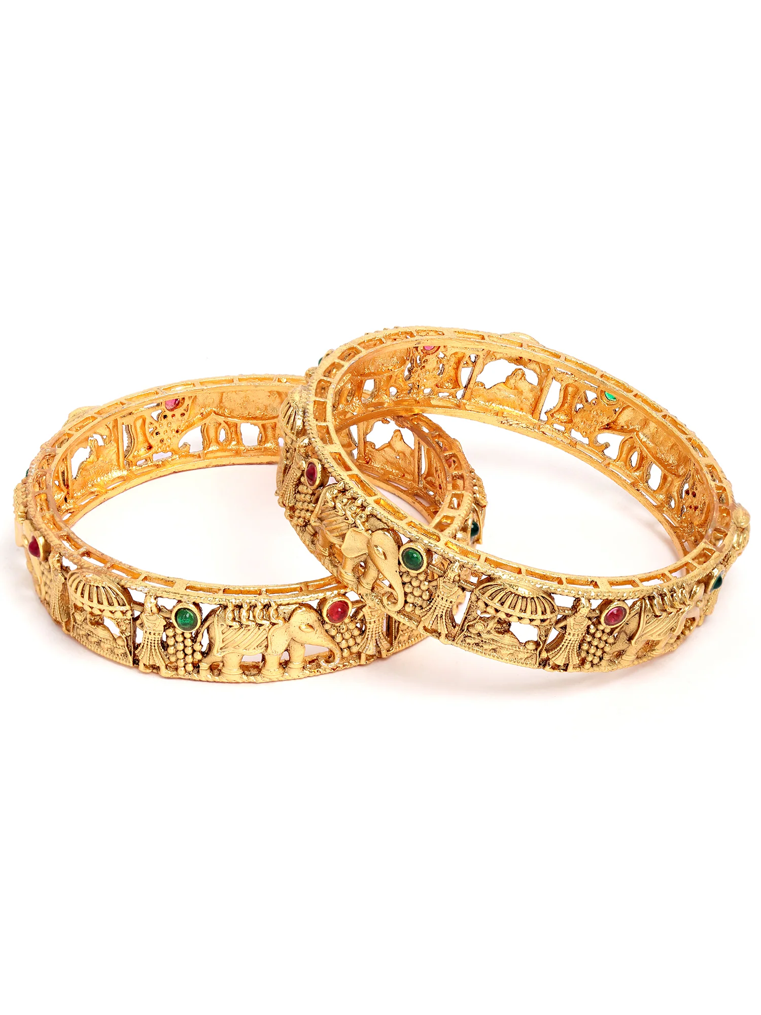 - Karatcart Set of 2 Antique Gold Plated Rajwadi Temple Bangles for Women .It's Five Layer Micro Gold Plated and Embellished with Kundan for High Durability. Intricate high polish creates glamorous reflections and adds a luxurious look. Perfect for Weddings, Festivals, Traditional Occasions. Best when paired with any Indian or Indo-Western Attire.