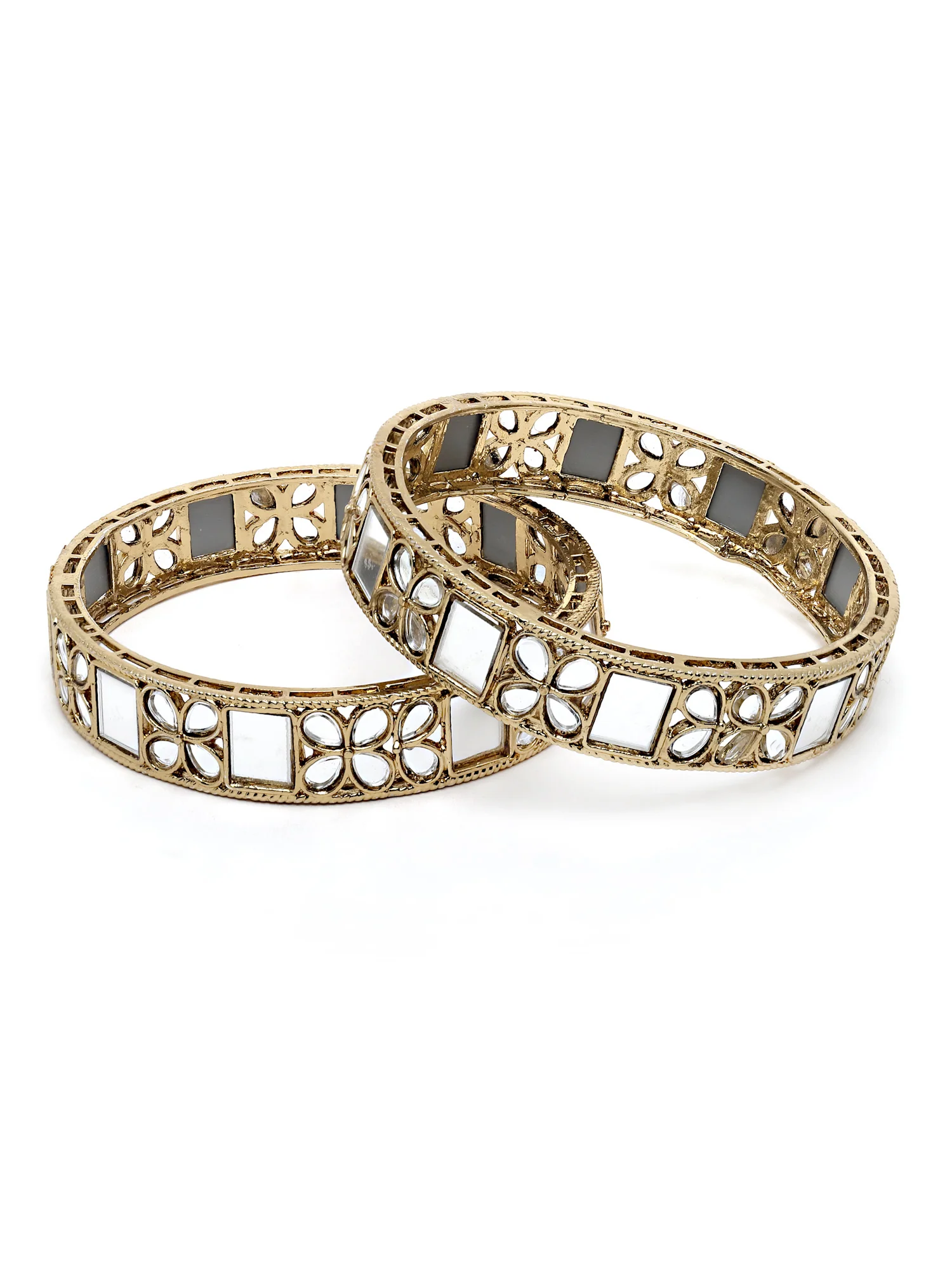 - Antique Gold Plated Floral Mirror Work Kundan Bangle Set for Women. The bangle has intricate cutwork & floral work. This authentic Indian design symbolizes the ancient jewelry-making art of India. These are a perfect bangle set for occasion and casual wear.